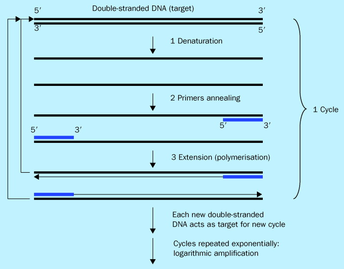 The regions of the template DNA downstream of the primers are thus selectively synthesized. In the next cycle, the fragments synthesized in the previous cycle are in turn matrix and after a few cycles, the predominant species corresponds to the DNA sequence between the regions where the primers hybridize. It takes 20–40 cycles to synthesize an analyzable amount of DNA (about 0.1 μg). Each cycle theoretically doubles the amount of DNA present in the previous cycle.